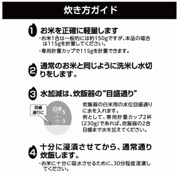 付属の専用計量カップで本品を計量し、洗米後、炊飯釜の水位目盛通りに水を加えて炊飯するだけで、