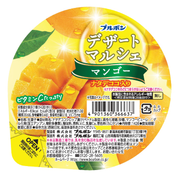 ゼリーをより甘くおいしくリニューアルしました。マンゴーピューレを配合したゼリーにナタデココを合わせた定番デザートです。