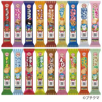 プチチョコチップ・プチしっとりクッキー・プチココア・プチキャラメルサブレ・プチチョコ&全粒粉・プチバタークッキー・プチうましおプレッツェル・プチホワイトラングドシャ・プチいちごラングドシャ・プチチーズ・プチバニラクラッカー・プチポテトうすしお味・プチポテトのりしお味・プチおこげせん・プチえび・プチベジチップス・プチあまじょっパウダーせん・プチサラダせんうましお味