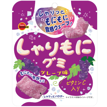 甘酸っぱしゃりしゃりパウダーがたっぷりついた、もちむにグミの食感連鎖が楽しいグレープ味のグミです。