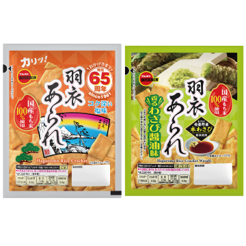 国産もち米を使用しカリッと香ばしく焼いたあられを、わさび醤油味に仕上げました。